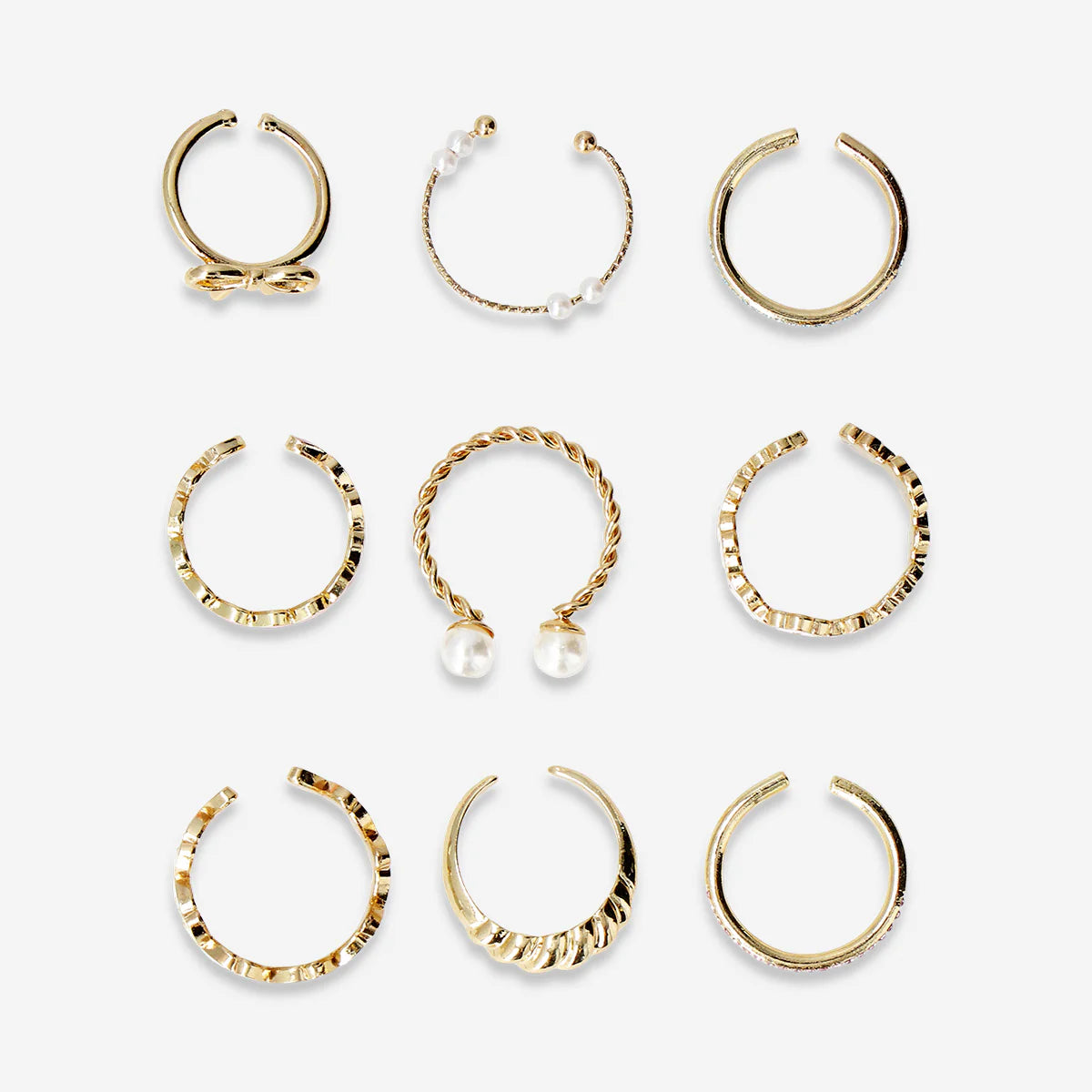 Enhance any outfit with this elegant set of adjustable rings in gold designs, perfect for adding a touch of sparkle to your everyday look. Made of metal, the set includes nine beautifully crafted rings in assorted styles, each measuring approximately 0.5 x 2 cm. From delicate twisted bands to playful heart and floral shapes, each piece offers its own charm, allowing you to mix and match for different occasions. The adjustable fit ensures comfort and versatility, making them suitable for any finger. Ideal for casual wear or dressing up an evening outfit, this gold ring set brings effortless style and a touch of shine to your jewellery collection.